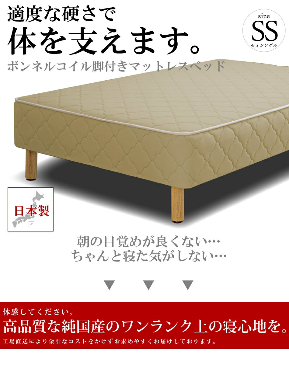 ボンネルコイル脚付きマットレスベッド 商品の詳細 サイズ セミシングルサイズ 幅85cm×長さ195cm×厚み約25cm 全体高さは木脚により変動します。