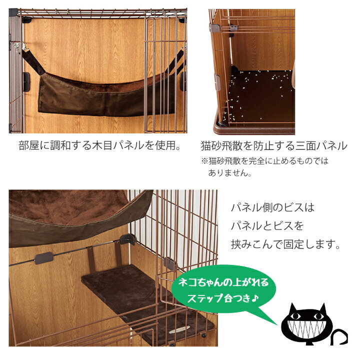 (仕様) ●本体サイズ:約 幅72×奥行60×高さ104cm ●本体重量:約12kg ●材質 ・フェンス:スチールロッド(ポリエステル塗装仕上げ) ・木目パネル:人口木材(PVC樹脂混合) ・ブーツ,各ジョイント:PP樹脂 ・ドアロック,底トレー:ABS樹脂 ・棚:パーティクルボード(ポリエステル生地貼り) ・ハンモック:綿,ポリエステル,鋼ナスカン (ご使用上の注意) ・組み立てやご使用に際しては、乱暴に扱うと破損やケガの原因に なりますので丁寧にお取り扱いください。