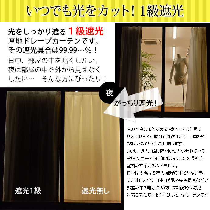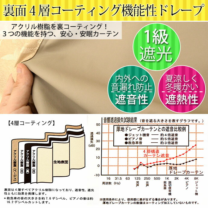 ■ ドレープカーテンの機能 遮光1級、遮熱性、遮音性、タッセル2枚付き(カーテンと同布)、洗濯機で丸洗い可能 ■ レースカーテンの機能 ミラー(昼間、外から室内が見えにくい)、洗濯機で丸洗い可能 ■ 製品重量 ・ドレープカーテン(1枚あたり) 100×135cm:約0.8kg、 100×178cm:約1.05kg、 100×200cm:約1.15kg ・レースカーテン(1枚あたり) 100×135cm:約0.25kg、 100×178cm:約0.3kg、 100×200cm:約0.35kg ■ 外装込み総重量 100×135cm:約2.45kg、 100×178cm:約3kg、 100×200cm:約3.25kg ■ 中国製 ※以下の点あらかじめご了承ください。